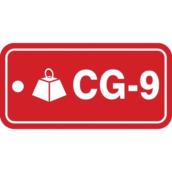 Energy Source ID Tag, Material Plastic, Legend CG-9, Height 1-1/2 In., Width 3 In., Withstand Pull Force 50 lb, Hole Size 3/16 In., Header No Header, Legend Color White, Background Color Red, Legend Style Symbol and Text, Write on Surface No