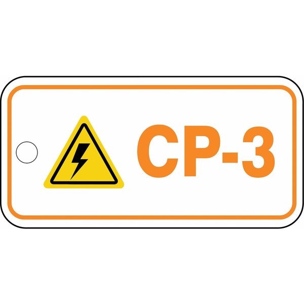 Energy Source ID Tag, Material Plastic, Legend CP-3, Height 1-1/2 In., Width 3 In., Withstand Pull Force 50 lb, Hole Size 3/16 In., Header No Header, Legend Color Orange, Background Color White, Legend Style Symbol and Text, Write on Surface No