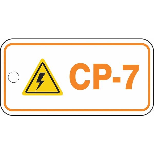 Energy Source ID Tag, Material Plastic, Legend CP-7, Height 1-1/2 In., Width 3 In., Withstand Pull Force 50 lb, Hole Size 3/16 In., Header No Header, Legend Color Orange, Background Color White, Legend Style Symbol and Text, Write on Surface No