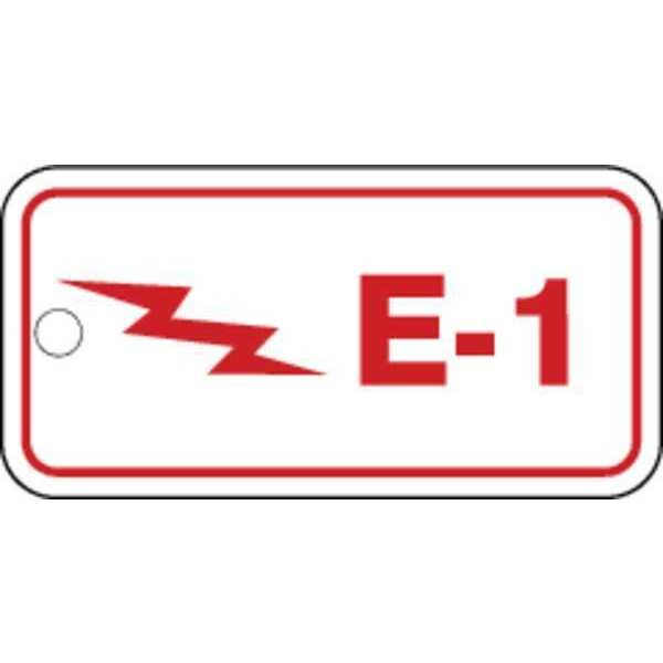 Energy Source ID Tag, Material Plastic, Legend E-1, Height 1-1/2 In., Width 3 In., Withstand Pull Force 50 lb, Hole Size 3/16 In., Header No Header, Legend Color Red, Background Color White, Legend Style Symbol and Text, Write on Surface No