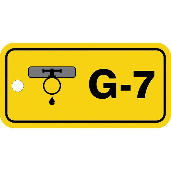 Energy Source ID Tag, Material Plastic, Legend G-7, Height 1-1/2 In., Width 3 In., Withstand Pull Force 50 lb, Hole Size 3/16 In., Header No Header, Legend Color Black, Background Color Yellow, Legend Style Symbol and Text, Write on Surface No