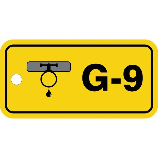 Energy Source ID Tag, Material Plastic, Legend G-9, Height 1-1/2 In., Width 3 In., Withstand Pull Force 50 lb, Hole Size 3/16 In., Header No Header, Legend Color Black, Background Color Yellow, Legend Style Symbol and Text, Write on Surface No
