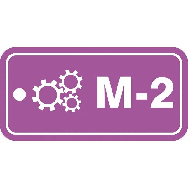 Energy Source ID Tag, Material Plastic, Legend M-2, Height 1-1/2 In., Width 3 In., Withstand Pull Force 50 lb, Hole Size 3/16 In., Header No Header, Legend Color White, Background Color Purple, Legend Style Symbol and Text, Write on Surface No