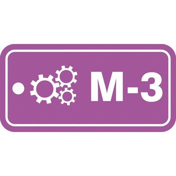 Energy Source ID Tag, Material Plastic, Legend M-3, Height 1-1/2 In., Width 3 In., Withstand Pull Force 50 lb, Hole Size 3/16 In., Header No Header, Legend Color White, Background Color Purple, Legend Style Symbol and Text, Write on Surface No