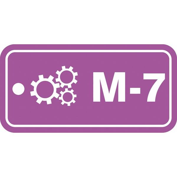 Energy Source ID Tag, Material Plastic, Legend M-7, Height 1-1/2 In., Width 3 In., Withstand Pull Force 50 lb, Hole Size 3/16 In., Header No Header, Legend Color White, Background Color Purple, Legend Style Symbol and Text, Write on Surface No
