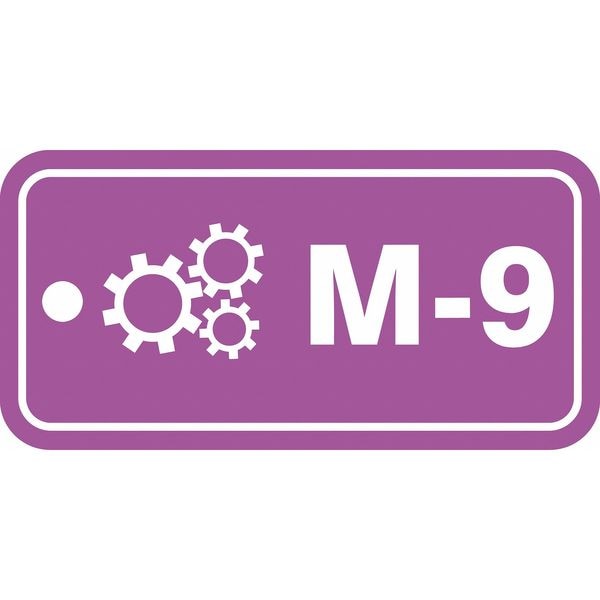Energy Source ID Tag, Material Plastic, Legend M-9, Height 1-1/2 In., Width 3 In., Withstand Pull Force 50 lb, Hole Size 3/16 In., Header No Header, Legend Color White, Background Color Purple, Legend Style Symbol and Text, Write on Surface No