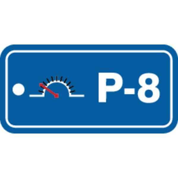 Energy Source ID Tag, Material Plastic, Legend P-8, Height 1-1/2 In., Width 3 In., Withstand Pull Force 50 lb, Hole Size 3/16 In., Header No Header, Legend Color White, Background Color Blue, Legend Style Symbol and Text, Write on Surface No
