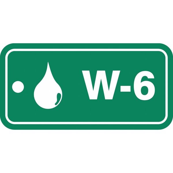 Energy Source ID Tag, Material Plastic, Legend W-6, Height 1-1/2 In., Width 3 In., Withstand Pull Force 50 lb, Hole Size 3/16 In., Header No Header, Legend Color White, Background Color Green, Legend Style Symbol and Text, Write on Surface No