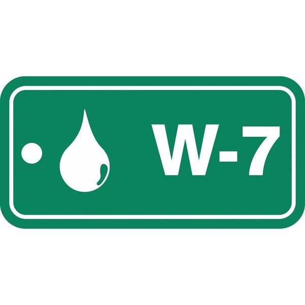 Energy Source ID Tag, Material Plastic, Legend W-7, Height 1-1/2 In., Width 3 In., Withstand Pull Force 50 lb, Hole Size 3/16 In., Header No Header, Legend Color White, Background Color Green, Legend Style Symbol and Text, Write on Surface No