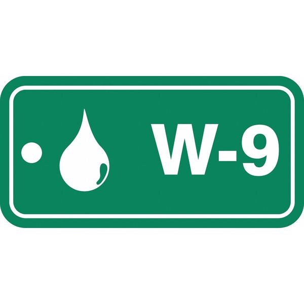 Energy Source ID Tag, Material Plastic, Legend W-9, Height 1-1/2 In., Width 3 In., Withstand Pull Force 50 lb, Hole Size 3/16 In., Header No Header, Legend Color White, Background Color Green, Legend Style Symbol and Text, Write on Surface No