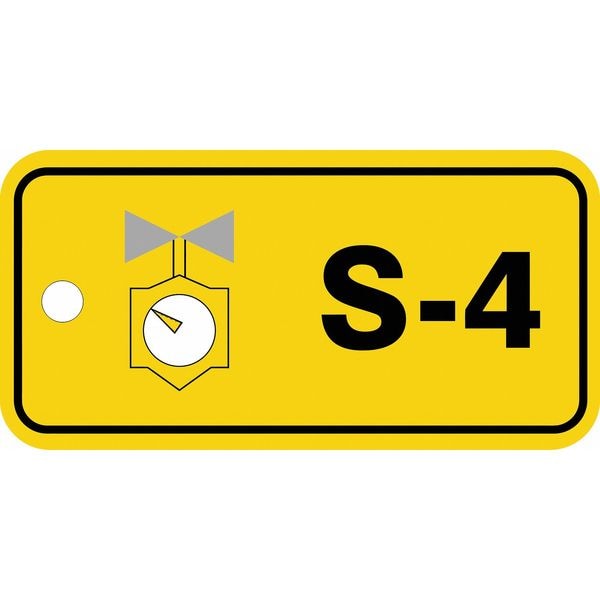 Energy Source ID Tag, Material Plastic, Legend S-4, Height 1-1/2 In., Width 3 In., Withstand Pull Force 50 lb, Hole Size 3/16 In., Header No Header, Legend Color Black, Background Color Yellow, Legend Style Symbol and Text, Write on Surface No
