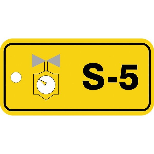 Energy Source ID Tag, Material Plastic, Legend S-5, Height 1-1/2 In., Width 3 In., Withstand Pull Force 50 lb, Hole Size 3/16 In., Header No Header, Legend Color Black, Background Color Yellow, Legend Style Symbol and Text, Write on Surface No