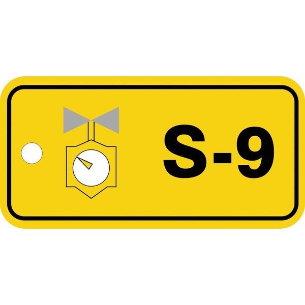 Energy Source ID Tag, Material Plastic, Legend S-9, Height 1-1/2 In., Width 3 In., Withstand Pull Force 50 lb, Hole Size 3/16 In., Header No Header, Legend Color Black, Background Color Yellow, Legend Style Symbol and Text, Write on Surface No