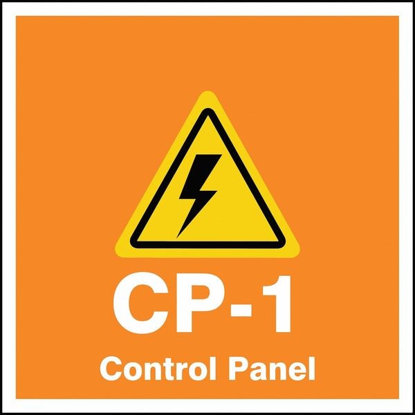 Energy Source ID Tag, Material Vinyl, Legend CP-1 Control Panel, Height 2 1/2 in, Width 2 1/2 in, Header No Header, Legend Color Orange, Background Color White, Legend Style Symbol and Text, Write on Surface No