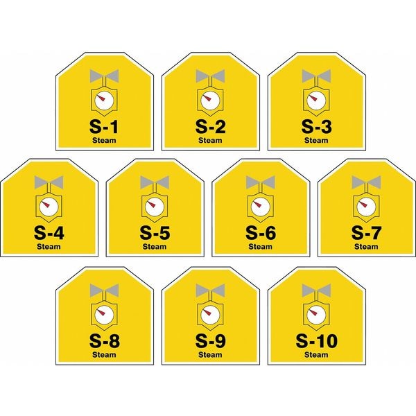 Energy Source ID Tag, Material Vinyl, Legend S-(1 to 10) Steam, Height 2-1/2 In., Width 2-1/2 In., Header No Header, Legend Color Black, Background Color Yellow, Legend Style Symbol and Text, Write on Surface No, Package Quantity 10