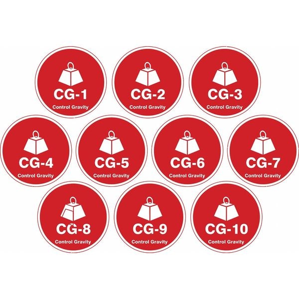 Energy Source ID Tag, Material Vinyl, Legend CG-(1 to 10) Control Gravity, Height 2-1/2 In., Width 2-1/2 In., Header No Header, Legend Color White, Background Color Red, Legend Style Symbol and Text, Write on Surface No, Package Quantity 10