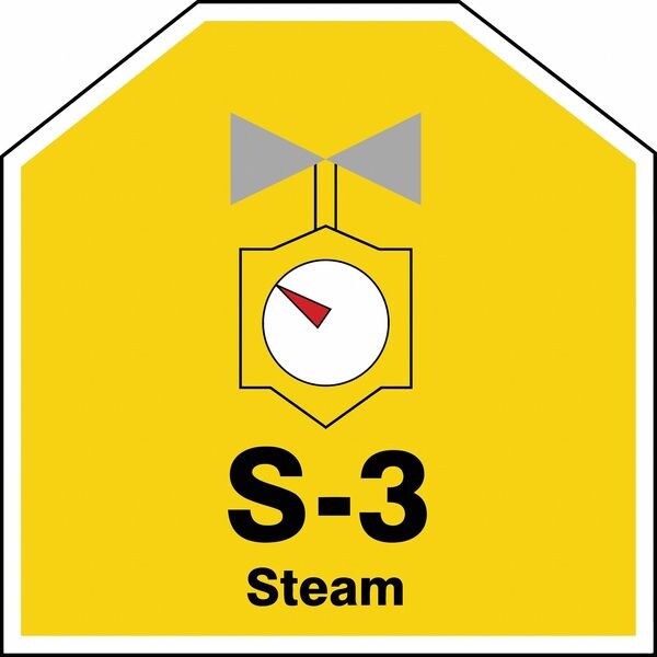 Energy Source ID Tag, Material Vinyl, Legend S-3 Steam, Height 2-1/2 In., Width 2-1/2 In., Header No Header, Legend Color Black, Background Color Yellow, Legend Style Symbol and Text, Write on Surface No