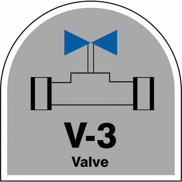 Energy Source ID Tag, Material Vinyl, Legend V-3 Valve, Height 2-1/2 In., Width 2-1/2 In., Header No Header, Legend Color Black, Background Color Gray, Legend Style Symbol and Text, Write on Surface No