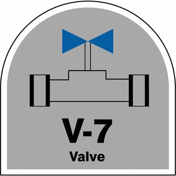 Energy Source ID Tag, Material Vinyl, Legend V-7 Valve, Height 2-1/2 In., Width 2-1/2 In., Header No Header, Legend Color Black, Background Color Gray, Legend Style Symbol and Text, Write on Surface No
