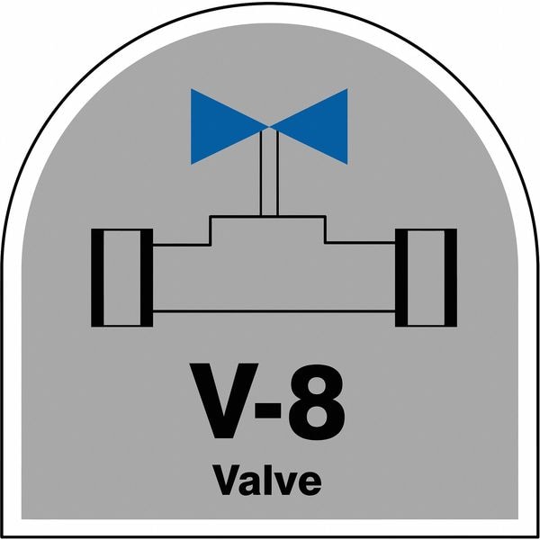 Energy Source ID Tag, Material Vinyl, Legend V-8 Valve, Height 2-1/2 In., Width 2-1/2 In., Header No Header, Legend Color Black, Background Color Gray, Legend Style Symbol and Text, Write on Surface No