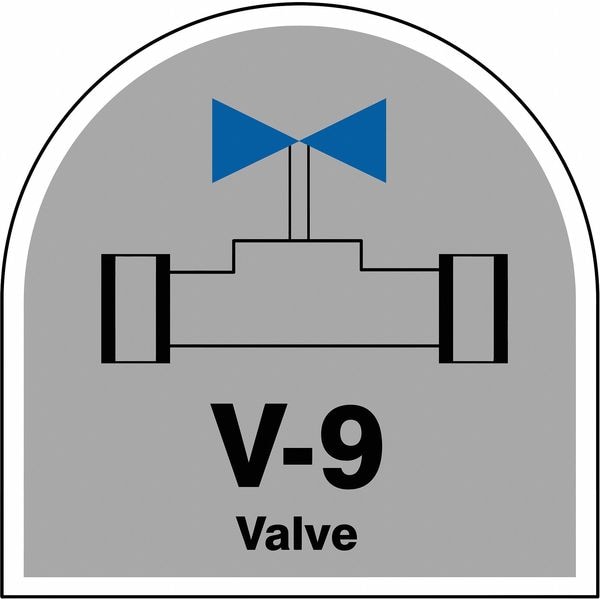 Energy Source ID Tag, Material Vinyl, Legend V-9 Valve, Height 2-1/2 In., Width 2-1/2 In., Header No Header, Legend Color Black, Background Color Gray, Legend Style Symbol and Text, Write on Surface No