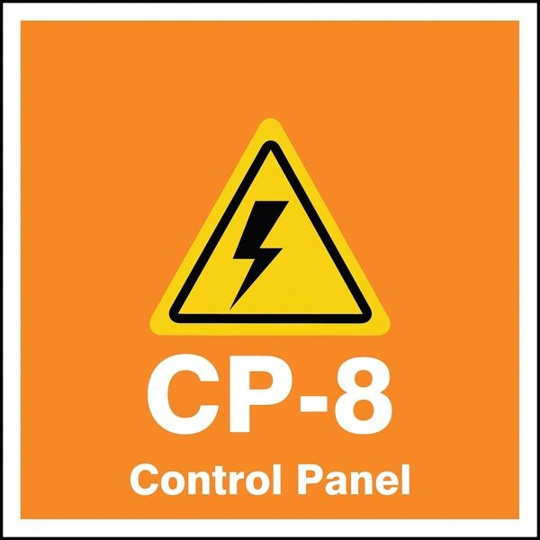 Energy Source ID Tag, Material Vinyl, Legend CP-8 Control Panel, Height 2-1/2 In., Width 2-1/2 In., Header No Header, Legend Color Orange, Background Color White, Legend Style Symbol and Text, Write on Surface No