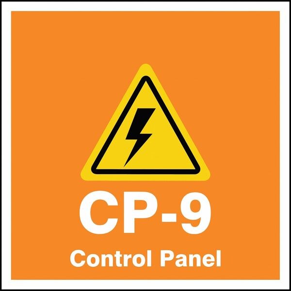 Energy Source ID Tag, Material Vinyl, Legend CP-9 Control Panel, Height 2-1/2 In., Width 2-1/2 In., Header No Header, Legend Color Orange, Background Color White, Legend Style Symbol and Text, Write on Surface No