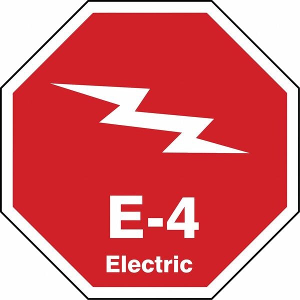 Energy Source ID Tag, Material Vinyl, Legend E-4 Electric, Height 2-1/2 In., Width 2-1/2 In., Header No Header, Legend Color White, Background Color Red, Legend Style Symbol and Text, Write on Surface No