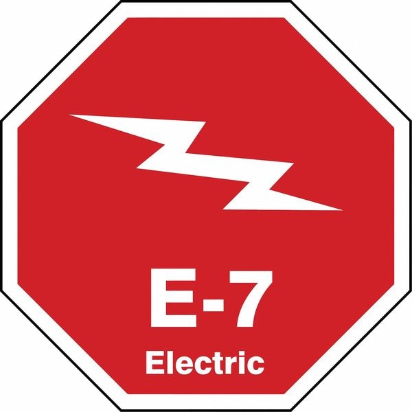 Energy Source ID Tag, Material Vinyl, Legend E-7 Electric, Height 2-1/2 In., Width 2-1/2 In., Header No Header, Legend Color White, Background Color Red, Legend Style Symbol and Text, Write on Surface No