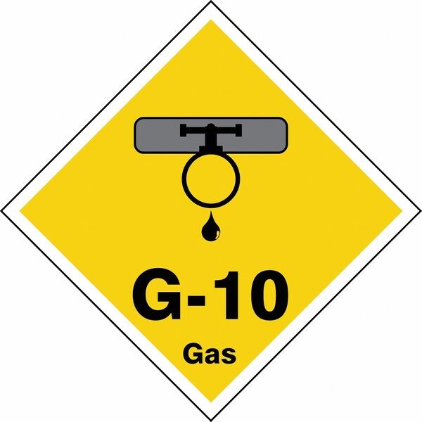 Energy Source ID Tag, Material Vinyl, Legend G-10 Gas, Height 2-1/2 In., Width 2-1/2 In., Header No Header, Legend Color Black, Background Color Yellow, Legend Style Symbol and Text, Write on Surface No