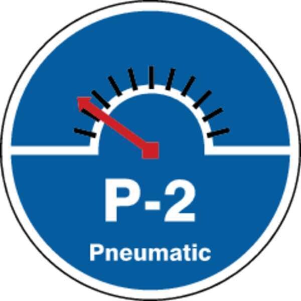 Energy Source ID Tag, Material Vinyl, Legend P-2 Pneumatic, Height 2-1/2 In., Width 2-1/2 In., Header No Header, Legend Color White, Background Color Blue, Legend Style Symbol and Text, Write on Surface No