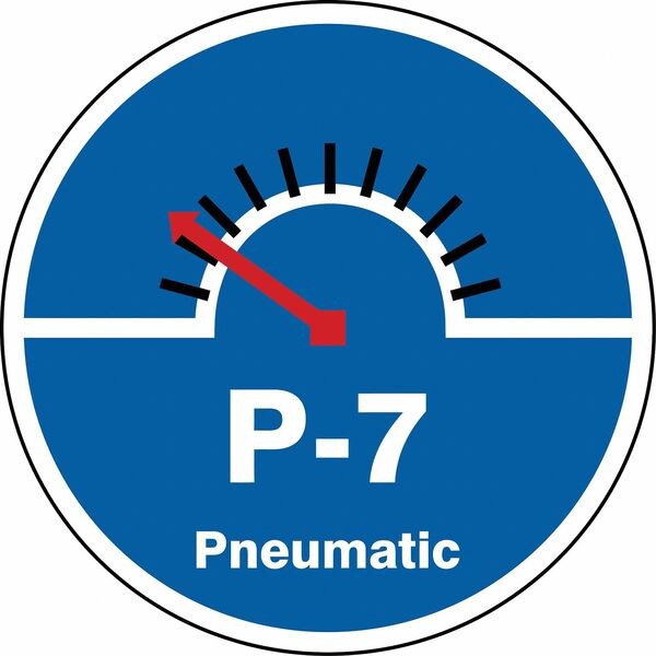 Energy Source ID Tag, Material Vinyl, Legend P-7 Pneumatic, Height 2-1/2 In., Width 2-1/2 In., Header No Header, Legend Color White, Background Color Blue, Legend Style Symbol and Text, Write on Surface No