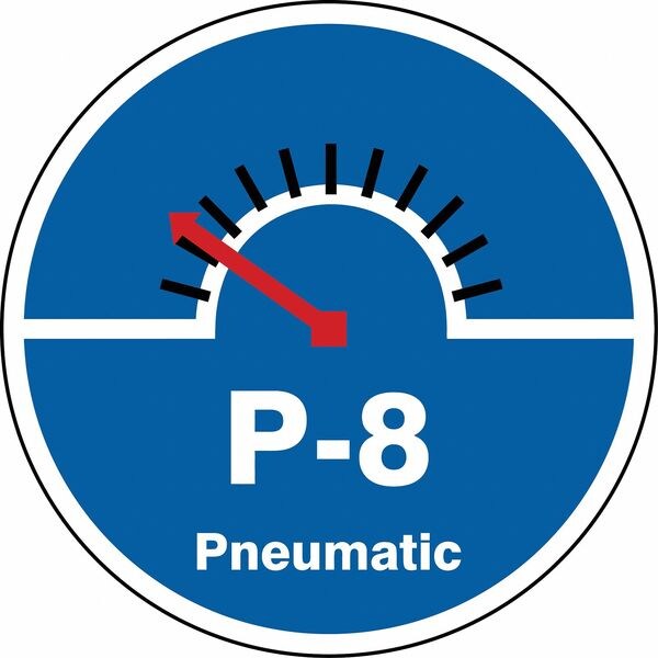 Energy Source ID Tag, Material Vinyl, Legend P-8 Pneumatic, Height 2-1/2 In., Width 2-1/2 In., Header No Header, Legend Color White, Background Color Blue, Legend Style Symbol and Text, Write on Surface No
