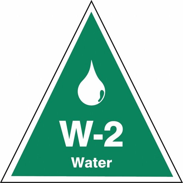 Energy Source ID Tag, Material Vinyl, Legend W-2 Water, Height 2-1/2 In., Width 2-1/2 In., Header No Header, Legend Color White, Background Color Green, Legend Style Symbol and Text, Write on Surface No