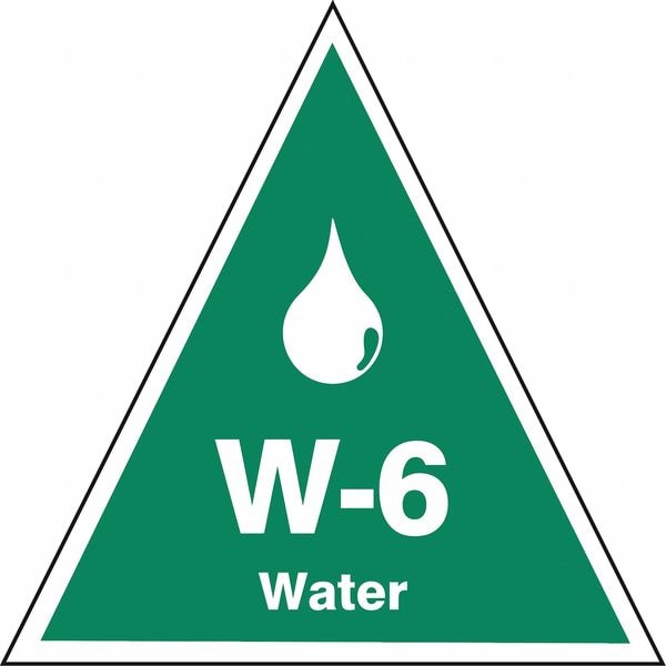 Energy Source ID Tag, Material Vinyl, Legend W-6 Water, Height 2-1/2 In., Width 2-1/2 In., Header No Header, Legend Color White, Background Color Green, Legend Style Symbol and Text, Write on Surface No