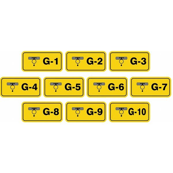 Energy Source ID Tag, Material Vinyl, Legend G-(1 to 10), Height 1-1/2 In., Width 3 In., Header No Header, Legend Color Black, Background Color Yellow, Legend Style Symbol and Text, Write on Surface No, Package Quantity 10
