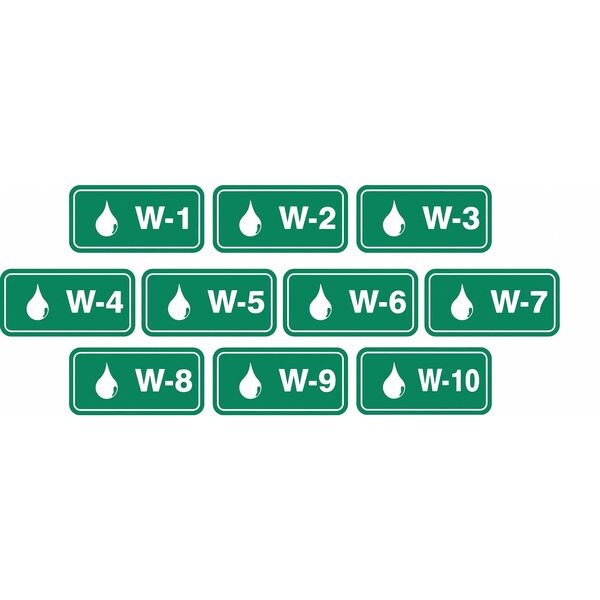 Energy Source ID Tag, Material Vinyl, Legend W-(1 to 10), Height 1-1/2 In., Width 3 In., Header No Header, Legend Color White, Background Color Green, Legend Style Symbol and Text, Write on Surface No, Package Quantity 10