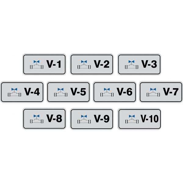 Energy Source ID Tag, Material Vinyl, Legend V-(1 to 10), Height 1-1/2 In., Width 3 In., Header No Header, Legend Color Black, Background Color Gray, Legend Style Symbol and Text, Write on Surface No, Package Quantity 10