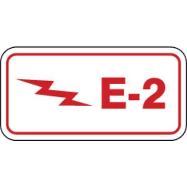 Energy Source ID Tag, Material Vinyl, Legend E-2, Height 1-1/2 In., Width 3 In., Header No Header, Legend Color Red, Background Color White, Legend Style Symbol and Text, Write on Surface No