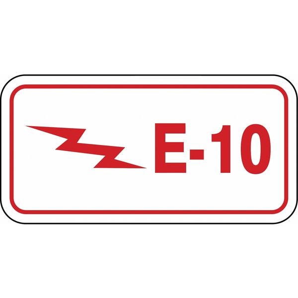 Energy Source ID Tag, Material Vinyl, Legend E-10, Height 1-1/2 In., Width 3 In., Header No Header, Legend Color Red, Background Color White, Legend Style Symbol and Text, Write on Surface No