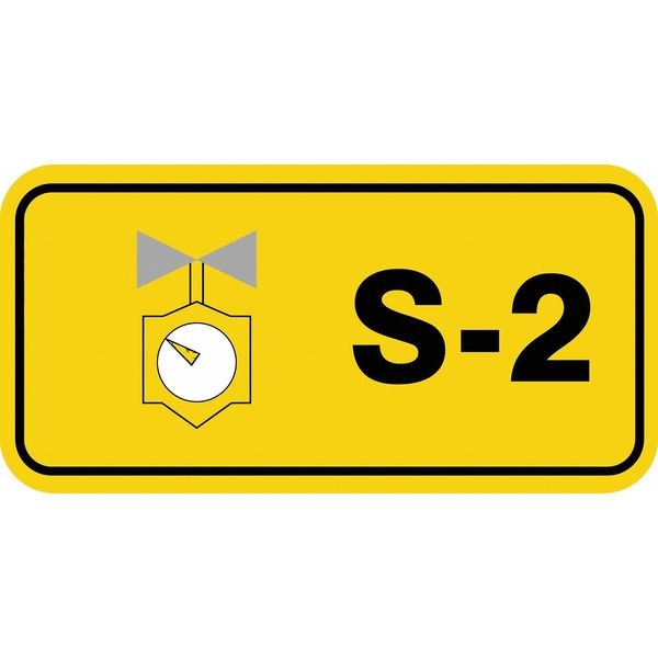 Energy Source ID Tag, Material Vinyl, Legend S-2, Height 1-1/2 In., Width 3 In., Header No Header, Legend Color Black, Background Color Yellow, Legend Style Symbol and Text, Write on Surface No