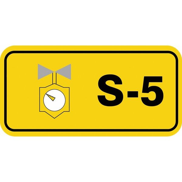 Energy Source ID Tag, Material Vinyl, Legend S-5, Height 1-1/2 In., Width 3 In., Header No Header, Legend Color Black, Background Color Yellow, Legend Style Symbol and Text, Write on Surface No