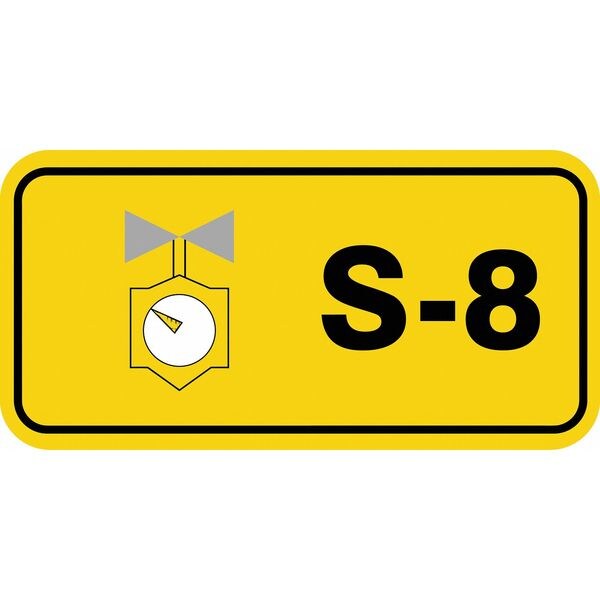 Energy Source ID Tag, Material Vinyl, Legend S-8, Height 1-1/2 In., Width 3 In., Header No Header, Legend Color Black, Background Color Yellow, Legend Style Symbol and Text, Write on Surface No