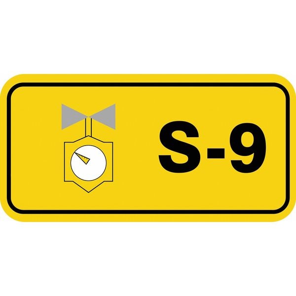 Energy Source ID Tag, Material Vinyl, Legend S-9, Height 1-1/2 In., Width 3 In., Header No Header, Legend Color Black, Background Color Yellow, Legend Style Symbol and Text, Write on Surface No