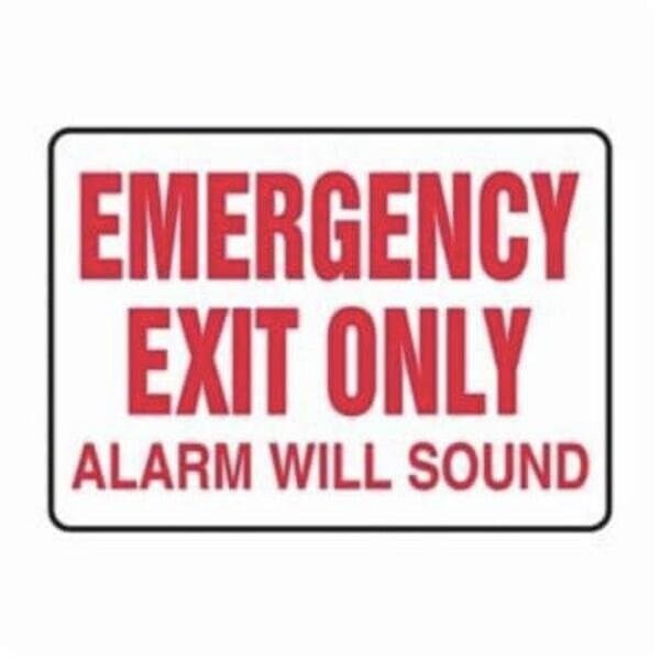 Accuform Emergency Exit Sign, Legend EMERGENCY EXIT ONLY ALARM WILL SOUND, 6 mil Adhesive DuraVinyl, 7 in Height, 10 in WidthSafety Signs identify and indicate potential, type, and degree of hazards that may lead to accidental injury or property damage Duallayered Adhesive DuraVinyl delivers exceptional flexibility and performance, outperforming standard vinyl Printed image is protected by a highgloss UV protective coating Adhesive DuraVinyl is durable, even in the toughest indoor and outdoor conditions, and adheres to most smooth, curved, and irregular surfaces
