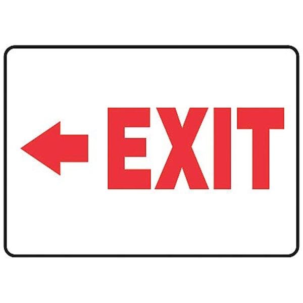 Exit Sign, Sign Subject Matter Exit and Entrance, Height 10 In., Width 14 In., Sign Material Vinyl, Sign Mounting Style Adhesive Surface, Header No Header, Legend Exit (Arrow Left), Printed Language English, Sign Shape Rectangle