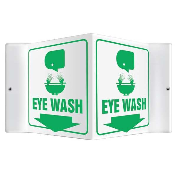V-Shape Projection Sign, Sign Subject Matter Eyewash and Shower, Height 6 in, Width 8 1/2 in, Sign Material Plastic, Sign Mounting Style V-Shaped, With Mounting Holes, Header No Header, Legend Eye Wash, Printed Language English, Sign Shape V-Shaped