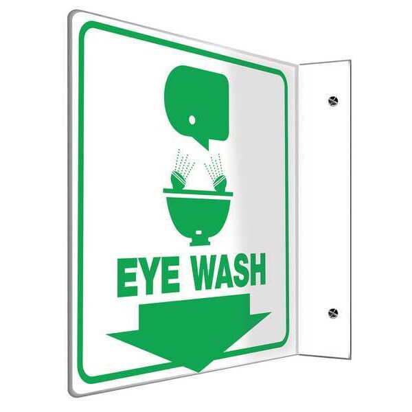 L-Shape Projection Sign, Sign Subject Matter Eyewash and Shower, Height 8 in, Width 8 in, Sign Material Plastic, Sign Mounting Style L-Shaped, With Mounting Holes, Header No Header, Legend Eye Wash, Printed Language English, Sign Shape L-Shaped