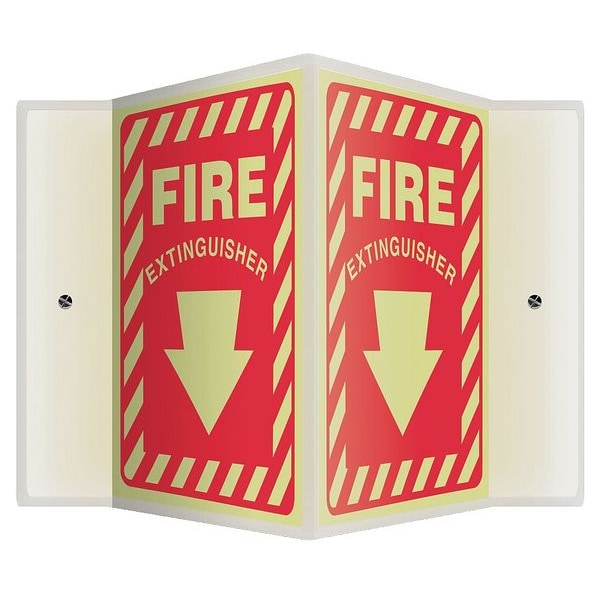 Fire Extinguisher Sign, Sign Subject Matter Fire Equipment, Height 12 in, Width 14 in, Sign Material Plastic, Sign Mounting Style With Mounting Holes, V-Shaped, Header No Header, Legend Fire Extinguisher, Printed Language English, Sign Shape V-Shaped