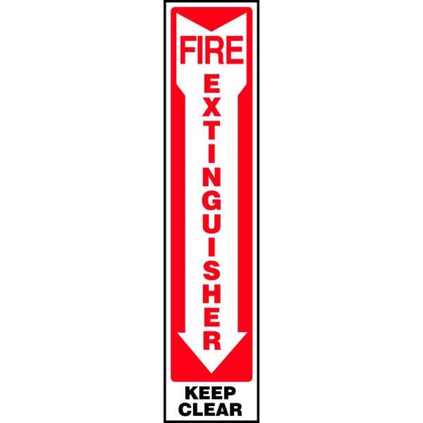 Fire Extinguisher Sign, Sign Subject Matter Fire Equipment, Height 18 in, Width 4 in, Sign Material Aluminum, Sign Mounting Style With Mounting Holes, Header No Header, Legend Fire Extinguisher Keep Clear, Printed Language English, Sign Shape Rectangle
